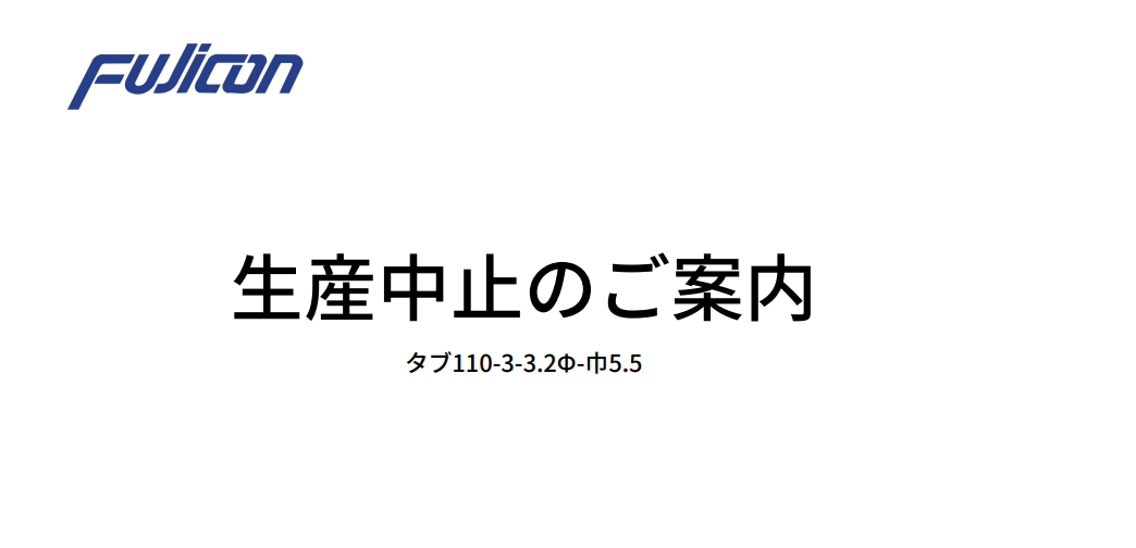 新着情報 2026年2月6日(金) 製品情報 お知らせ 生産中止のご案内【タブ110-3-3.2Φ-巾5.5】 「タブ110-3-3.2Φ-巾5.5」生産中止のご案内です。 ◇対象品目 ・F2035F-110-3 シリーズ ・F2061AXF-9289 シリーズ ◇代替機種 代替品は御座いません。 ★詳細は以下PDFの書面をご確認願います。 タブ110-3-3.2Φ-巾5.5生産中止のご案内 新着情報一覧