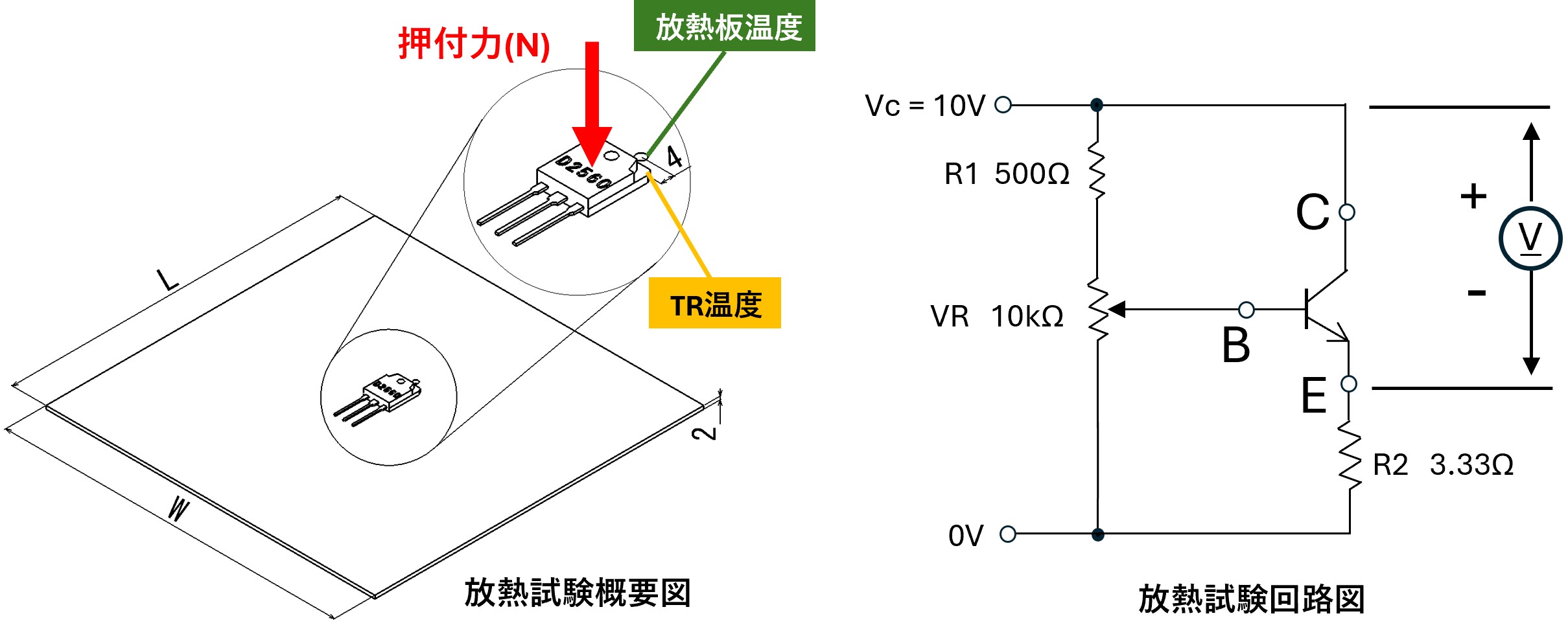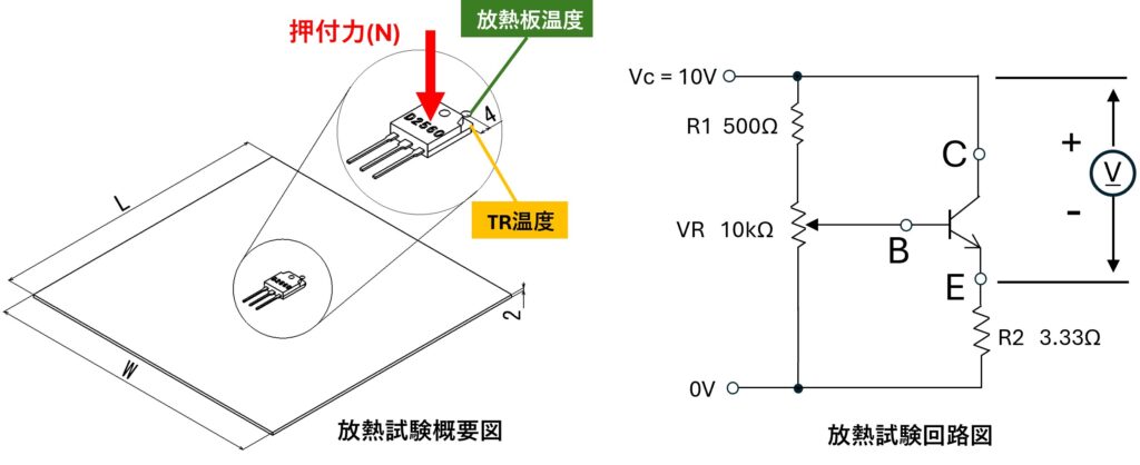 試験回路を組み、トランジスタを発熱させた状態で放熱板に押し当て